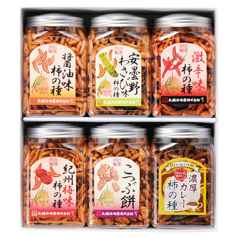 ポット柿の種(210g)・ポット柿の種安曇野産山葵味(210g)・ポット柿の種激辛味(200g)・ポット濃厚カレー柿の種(200g)・ポット柿の種紀州産梅味(210g)・ポットこつぶ餅(200g)×各1