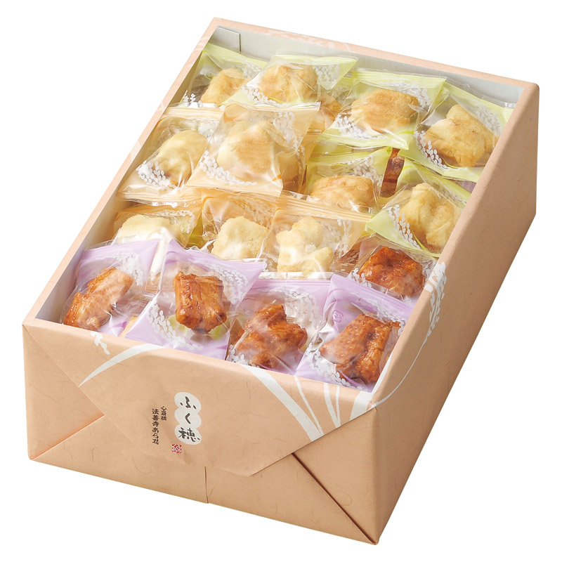 しっとりとした厚みでも、ふっくら、サクサクの「ふく穂」。その秘密は新技術のマイクロウェーブ加熱です。内部にも均等に火を通す焼き方なので、中までふっくらと焼きあげました。3種類のふんわりサクサクおかき詰合せギフトです。