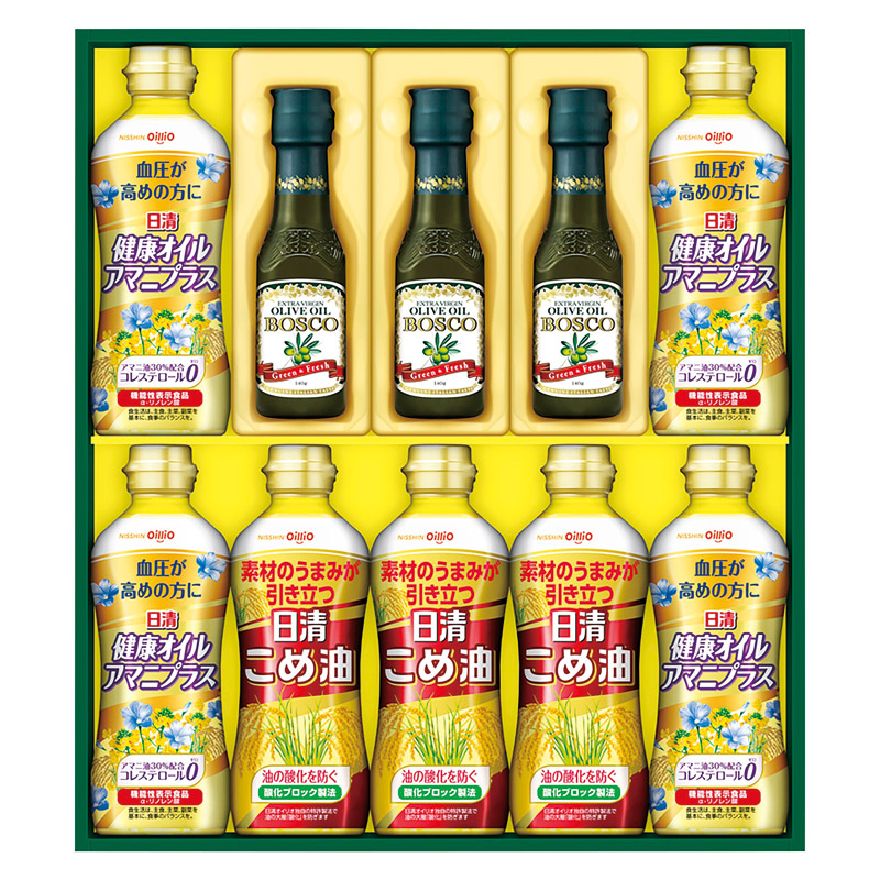 ボスコエキストラバージンオリーブオイル(140g)・こめ油(350g)×各3、健康オイルアマニプラス(350g)×4