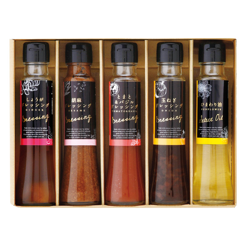 しょうがドレッシング(100ml)・胡麻ドレッシング(100ml)・とまと&バジルドレッシング(100ml)・玉ねぎドレッシング(100ml)・ひまわり油(90g)×各1