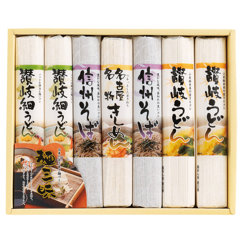 讃岐うどん(150g)・讃岐細うどん(150g)・信州そば(120g)×各2、名古屋名物きしめん(150g)×1