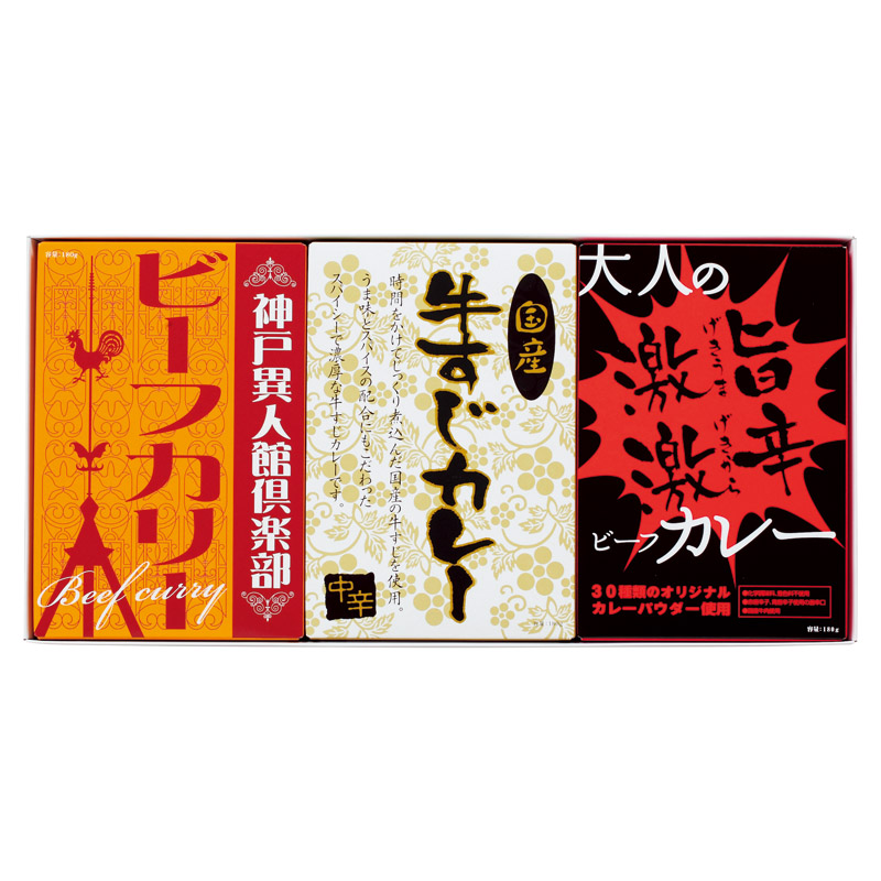 神戸異人館倶楽部ビーフカリー(180g)・国産牛すじカレー(180g)・大人の激旨激辛カレー(180g)×各1