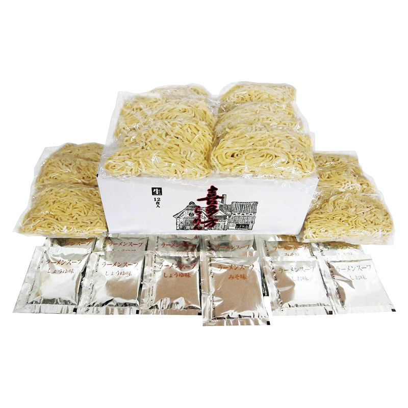 麺(生麺)(120g)×12食、スープ(醤油味)×6、スープ(味噌味・塩味)×各3