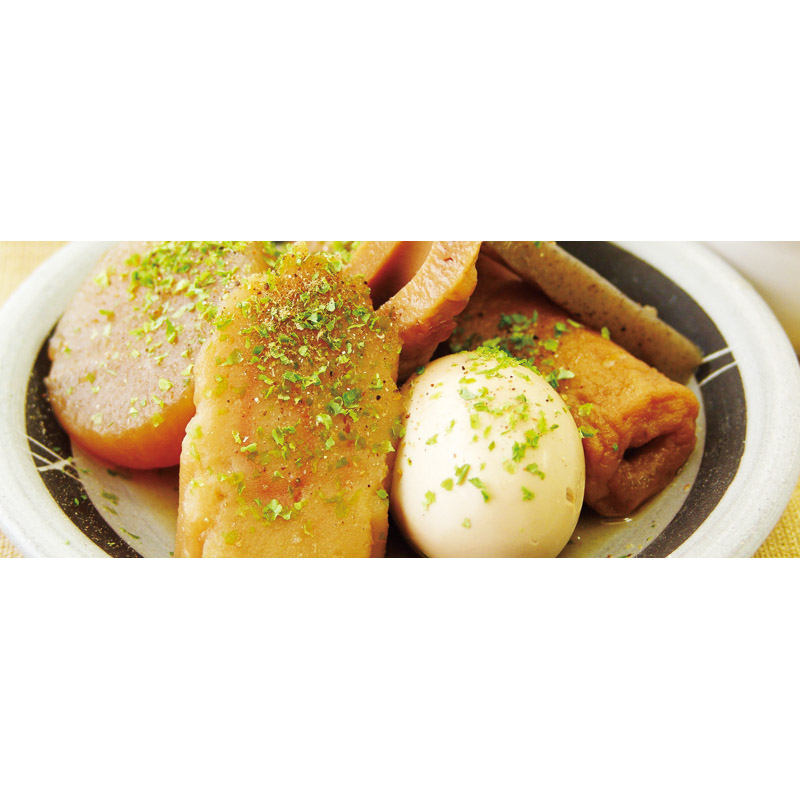 焼津おでん(360g)(大根・卵・黒はんぺん・なると巻・ごぼう巻・煮込みちくわ・こんにゃく)×5、だし粉×5