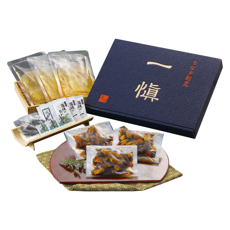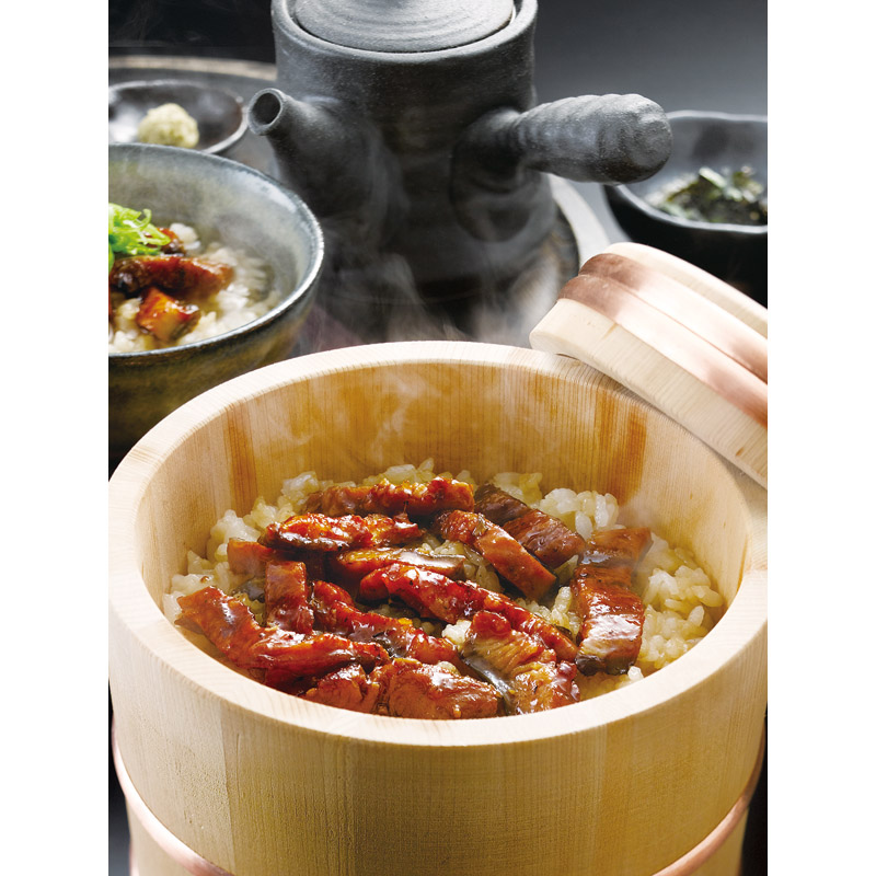 鰻きざみ(45g)・吸い地(ダシ)(120g)・タレ・山椒・おろしわさび(2g)・きざみのり(0.5g)×各3