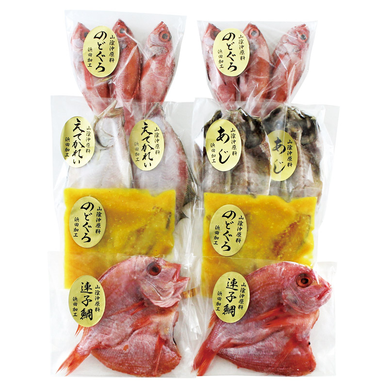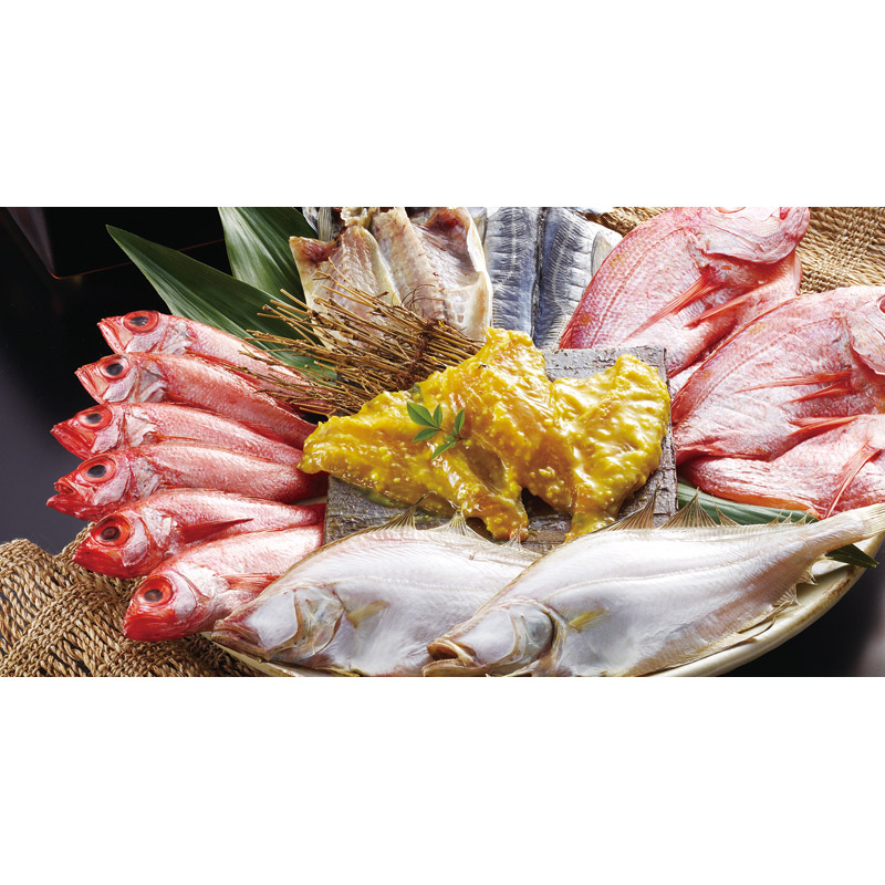 のどくろ(アカムツ)丸干し×6、のどくろ(アカムツ)開き味噌漬・あじ(マアジ)開き干し・連子鯛開き干し・えてかれい干し×各2