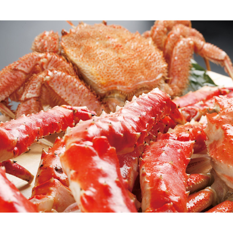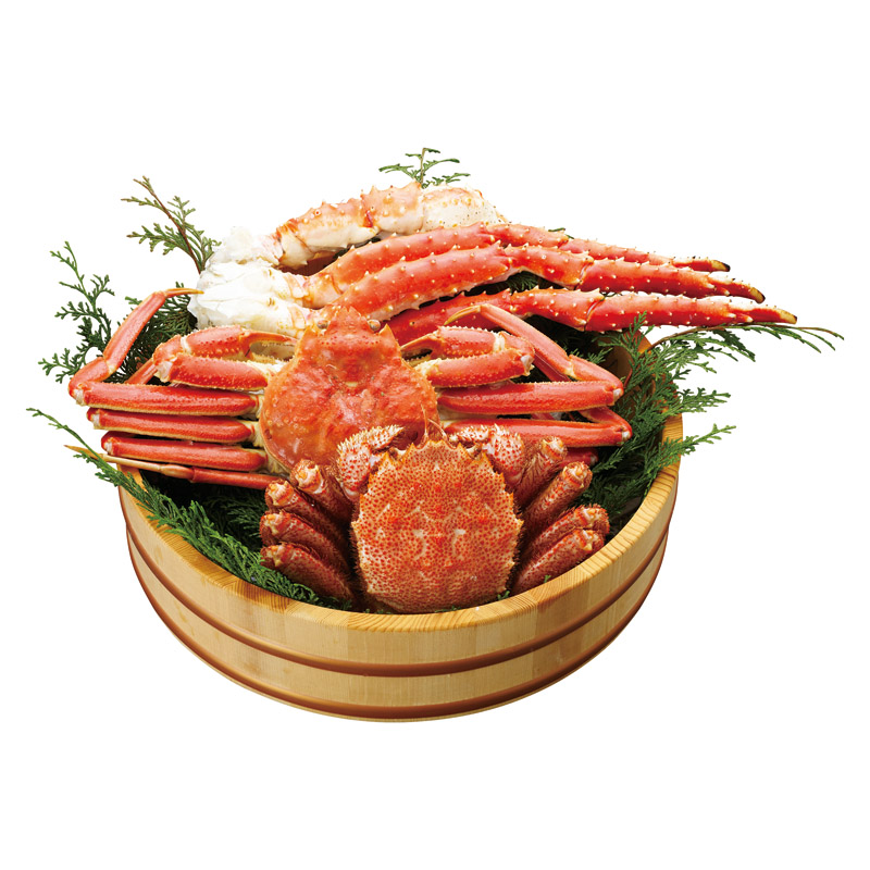 高級感あふれるたらばがに脚、食べやすさ抜群のずわいがに、そして身のびっしり詰まった旨さいちばんの毛がに。三大ガニが勢揃い。