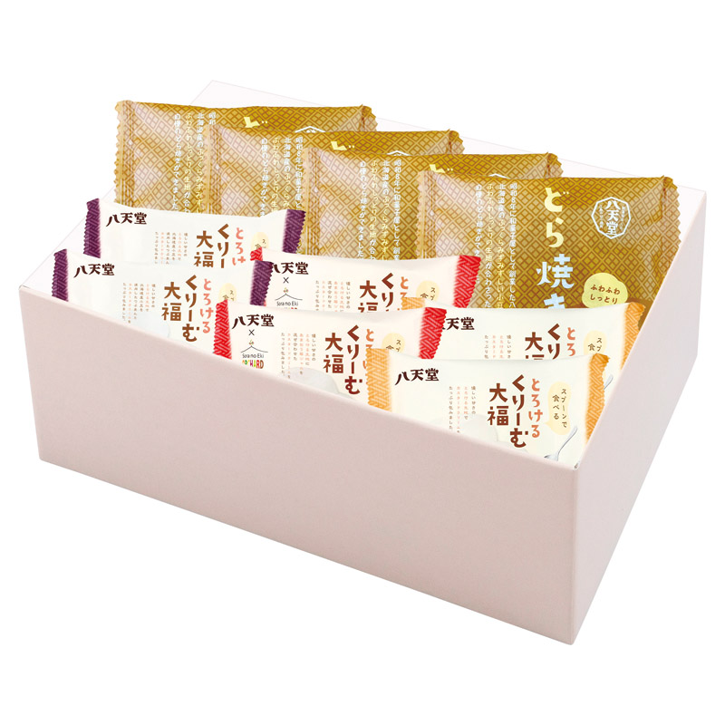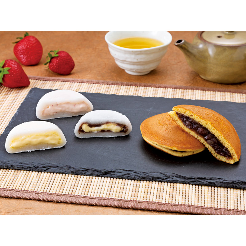 とろけるくりーむ大福(カスタード・つぶあんカスタード・あまおう苺)×各2、どら焼き×4