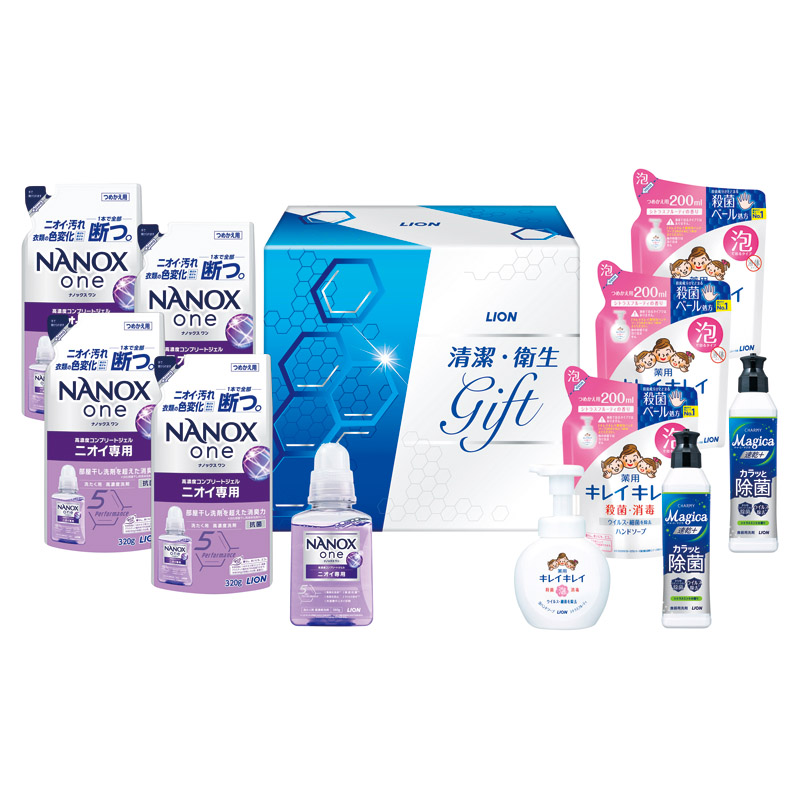 NANOX oneニオイ専用(380g)・キレイキレイ薬用泡ハンドソープ(250ml)×各1、NANOX oneニオイ専用詰め替え(320g)×4、キレイキレイ薬用泡ハンドソープ詰め替え(200ml)×3、チャーミーマジカ速乾+カラッと除菌シトラスミントの香り(220ml)×2