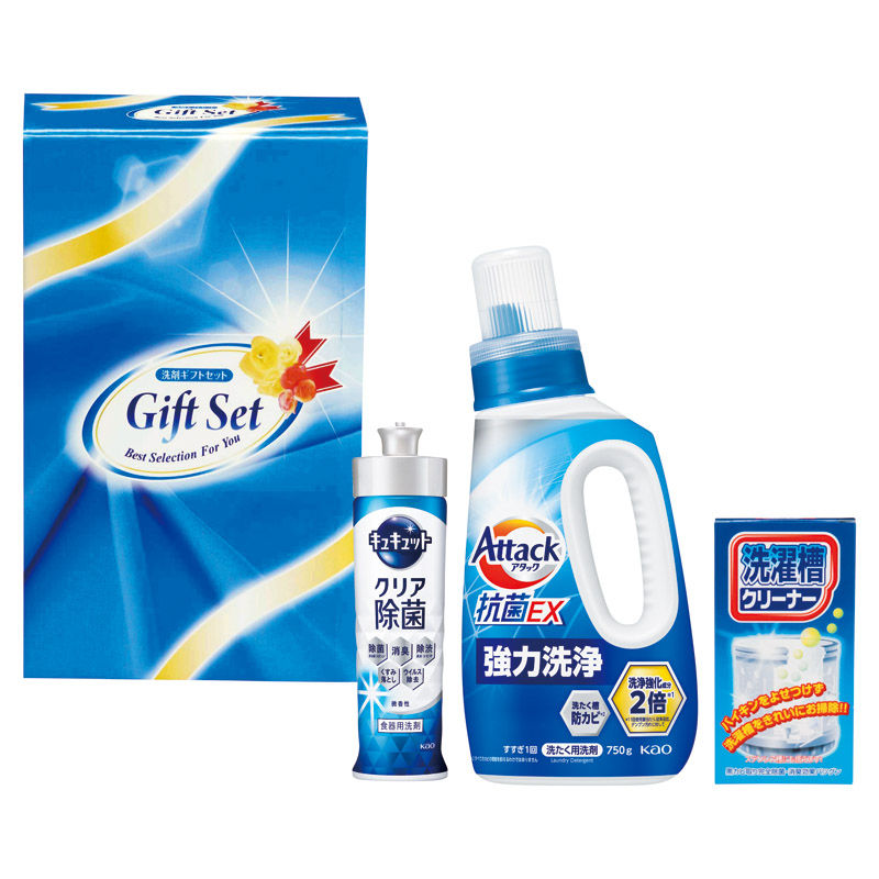 花王アタック抗菌EX(750g)・花王キュキュットクリア除菌(220ml)・洗濯槽クリーナー(5錠)×各1