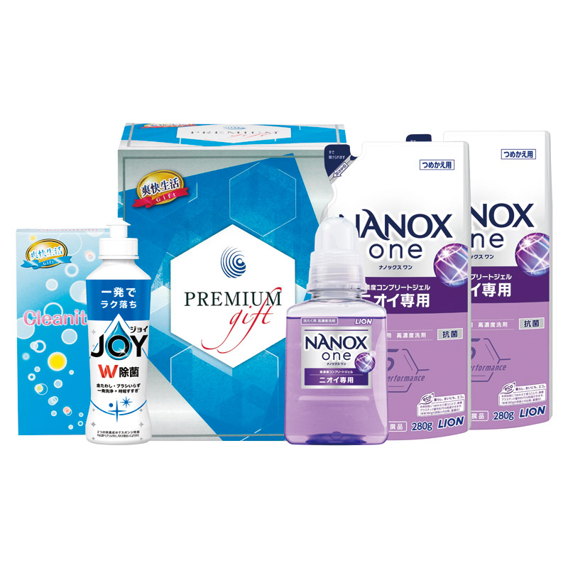 ライオンナノックスワンニオイ専用(380g)・洗濯ネット・P&G除菌ジョイコンパクト(170ml)×各1、ライオンナノックスワンニオイ専用詰め替え(280g)×2