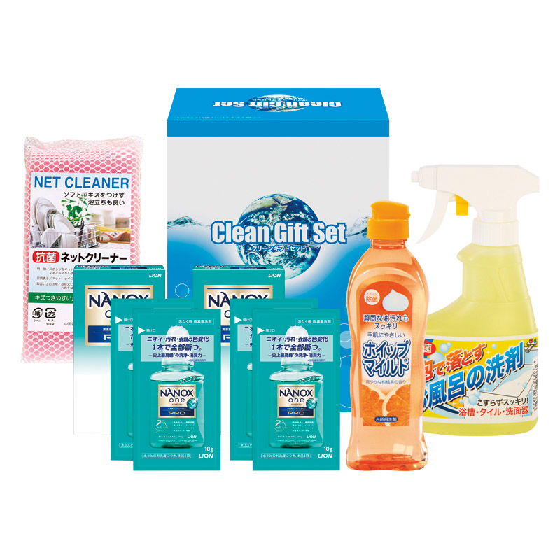 ライオンナノックスワンプロ(10g×2包)×2、台所洗剤(250ml)・お風呂の洗剤スプレー(300ml)・抗菌ネットクリーナー×各1