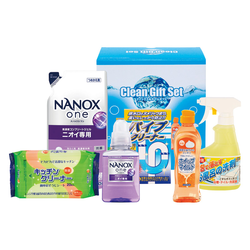 ライオンナノックスワンニオイ専用(380g)・ライオンナノックスワンニオイ専用詰め替え(280g)・台所洗剤(250ml)・お風呂の洗剤スプレー(300ml)・キッチンクリーナー20P・パイプクリーナー3P×各1