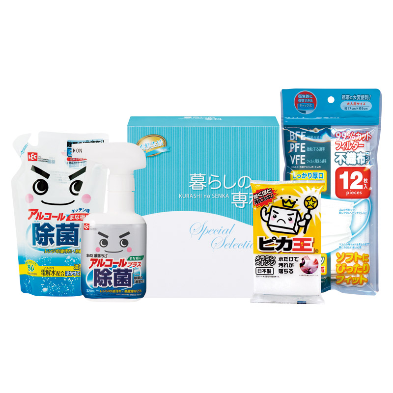 レック除菌の激落ちくん(320ml)・レック除菌の激落ちくん詰め替え(300ml)・不織布マスク大人用(12枚)・ピカ王ミニ×各1