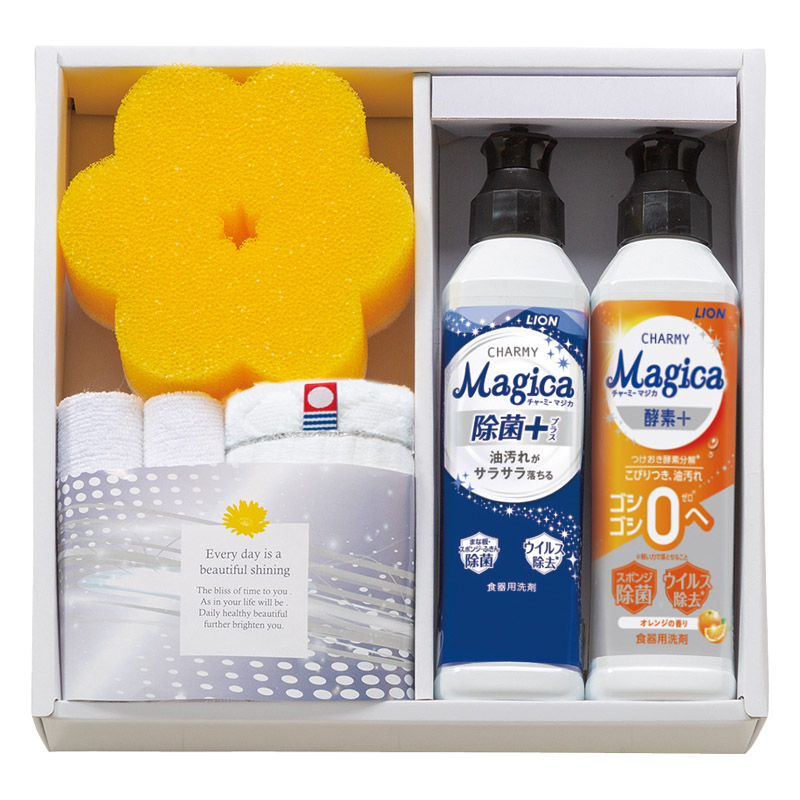 チャーミーマジカオレンジの香り(220ml)・チャーミーマジカ除菌プラス(220ml)・スポンジ・ウォッシュタオル(280×300mm)×各1、マイクロファイバークロス(250×250mm)×2
