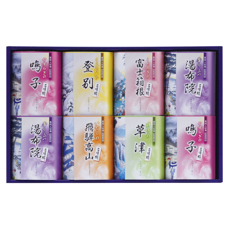 湯布院(25g×2入)・鳴子(25g×2入)×各2、登別(25g×2入)・富士箱根(25g×2入)・飛騨高山(25g×2入)・草津(25g×2入)×各1
