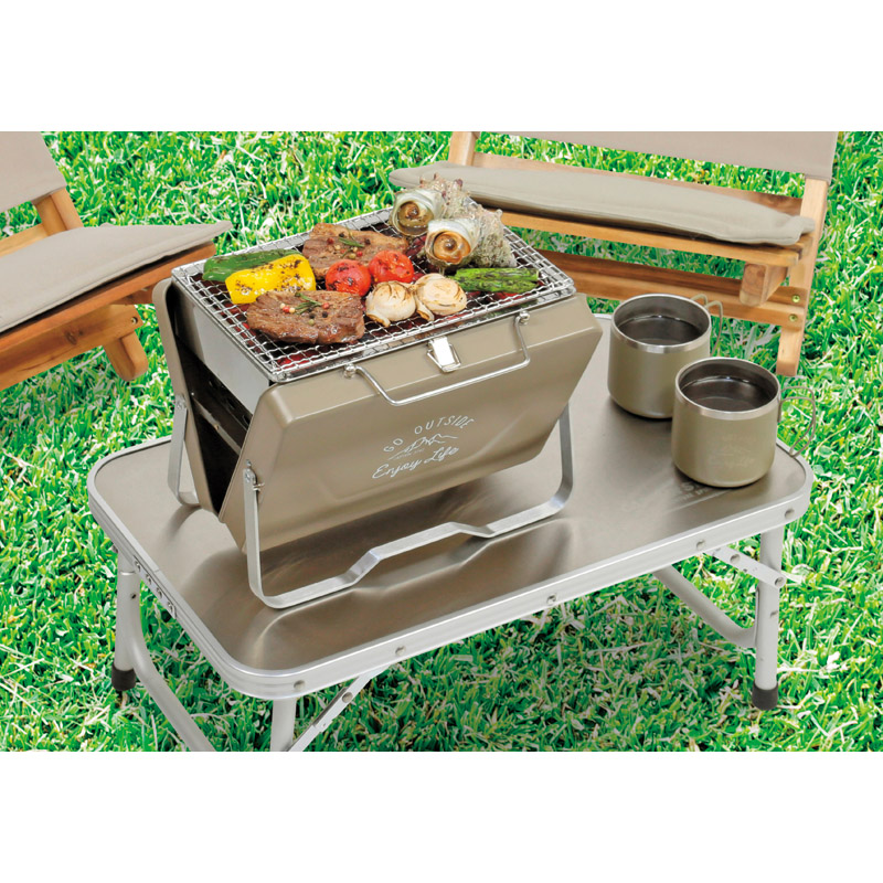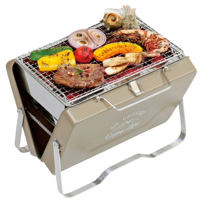 本体(使用時:約300×220×230mm/収納時:約300×240×70mm)・目皿フレーム・目皿(燃料用)・バーベキュー網×各1