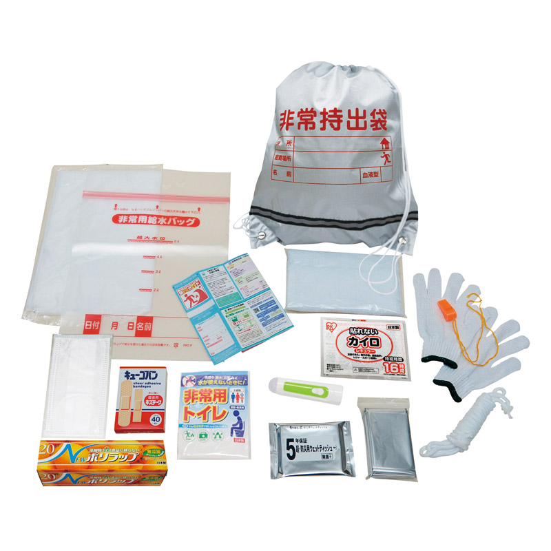 非常袋(約440×380mm)×1、非常用給水バッグ(5リットル)・ハンディライト・軍手・ロープ(3m)・笛・防寒シート・救急絆創膏(2サイズ40枚入)・カイロ・マスク・非常用トイレ・防災用ウエットティッシュ(20枚)・ゴミ袋(45リットル10枚入)・タオル・ラップ・防災ガイド×各1