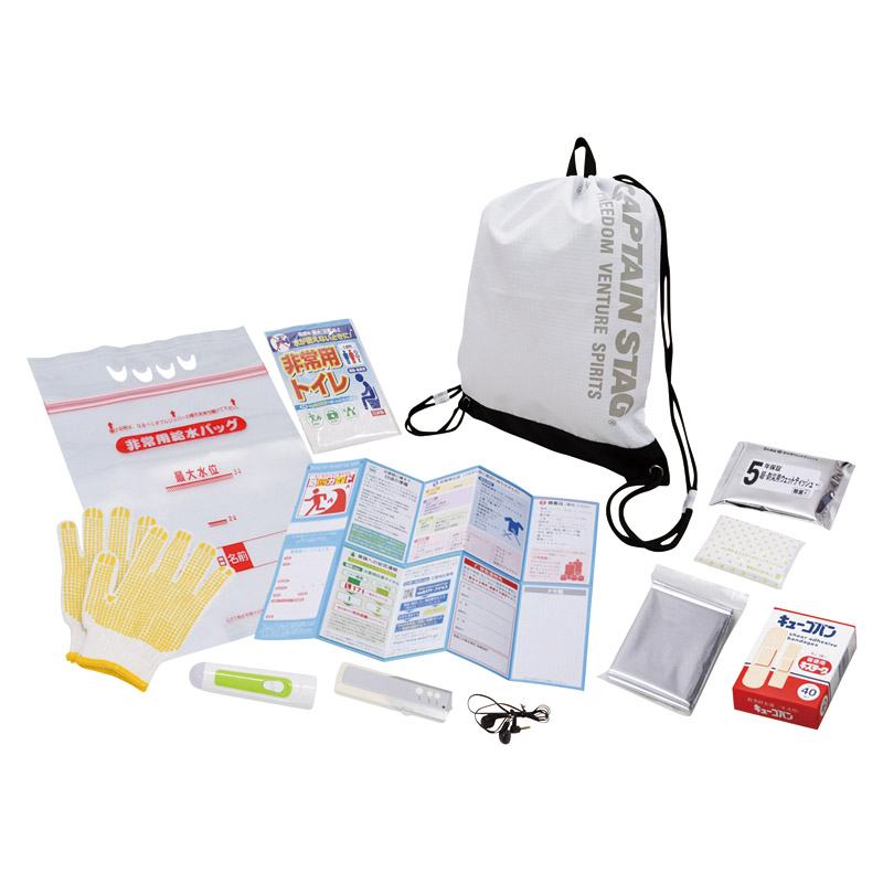ナップサック(約450×340mm)×1、非常用給水バッグ(3リットル)・ハンディライト・非常用トイレ・防寒シート・ポケットティッシュ(8W)・防災用ウエットティッシュ(20枚)・すべり止め手袋・救急絆創膏(2サイズ40枚入)・コンパクトFMラジオ・防災ガイド×各1