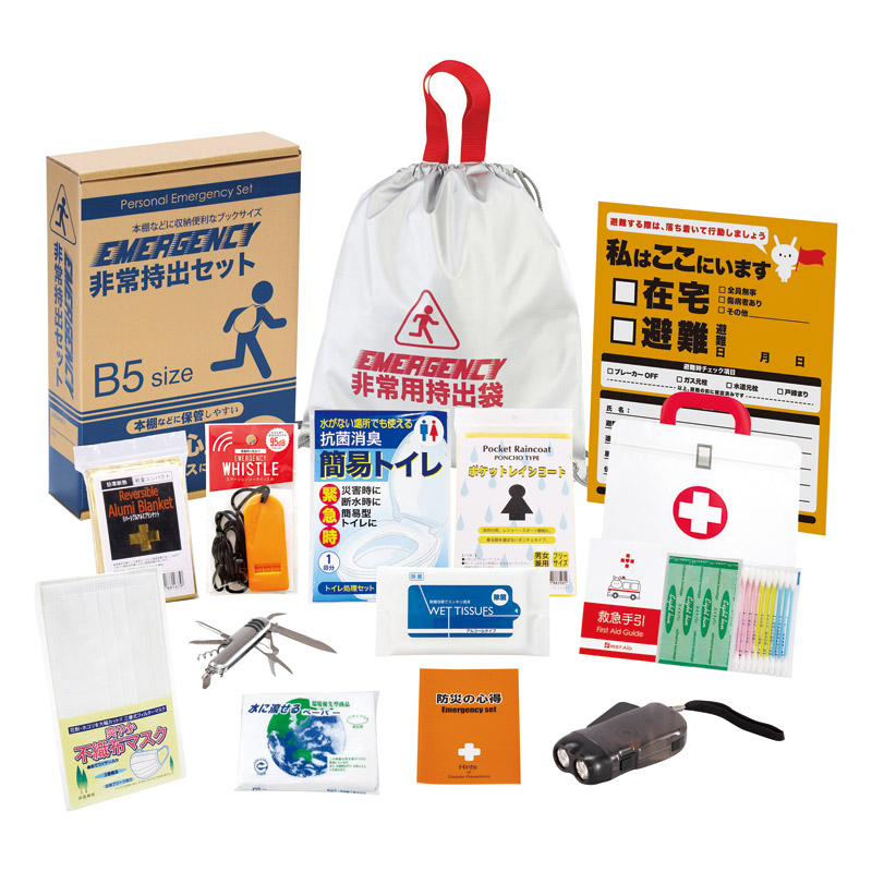 非常持出袋(約340×300mm)×1、防災の心得・ホイッスル・レインコート・抗菌消臭トイレ・ダイナモLEDライト・アルミブランケット・除菌アルコールウェットティッシュ・マスク・緊急避難カード・水に流せるペーパー・8徳ナイフ・救急4点セット×各1