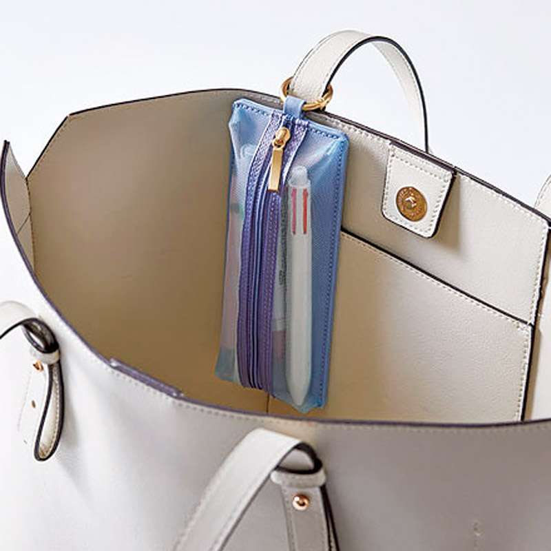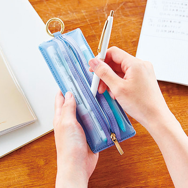 ノートや手帳と一緒に持ち運びやすいフラットなペンケース。裏面に名刺ポケット付き。