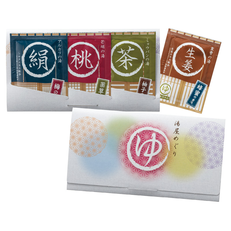 桃・生姜・茶・絹の4種類から3つをセットにした薬用入浴剤セット。桃:芒硝泉、生姜:重曹泉、茶:ミョウバン泉、絹:アルカリ泉。