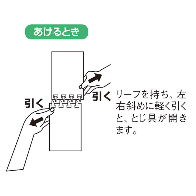 とじ具が開くので、リーフをやぶることなく簡単に抜き差し・交換ができます。