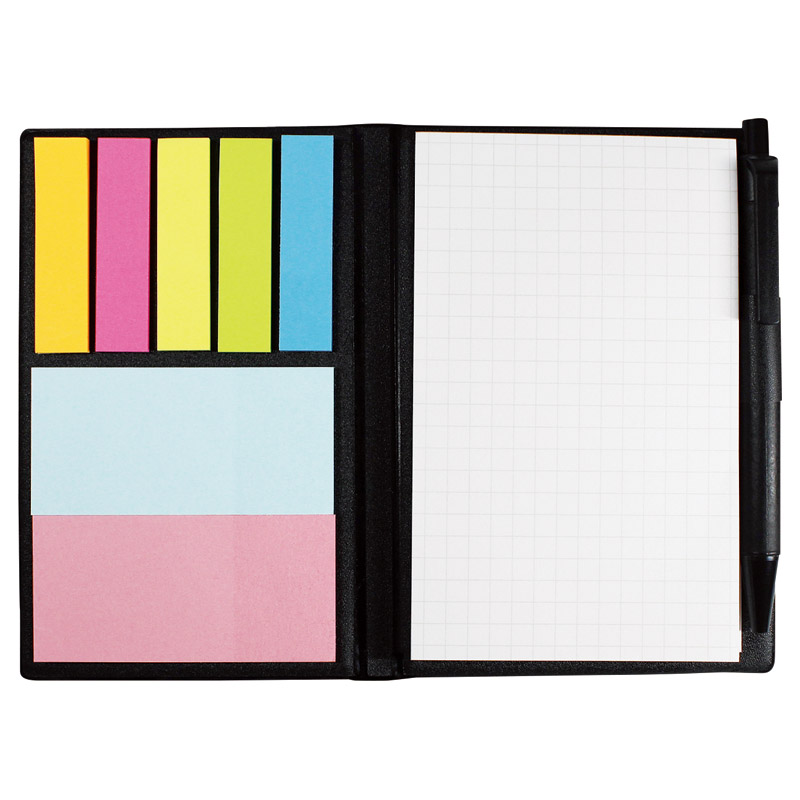 本体(約130×90×12mm)・メモ(70枚)・付箋(中)(25枚)・ペン×各1、インデックス付箋(25枚)×5