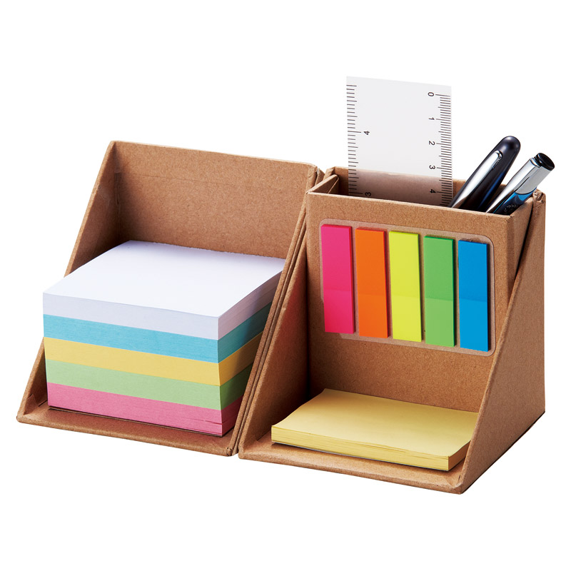 再生紙使用の実用的でボリュームもあるブロックメモと付箋のデスクセット。ペンスタンドも付いています。