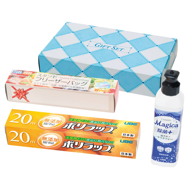 ポリラップ(22cm×20m)・ライオンチャーミーマジカ除菌プラス(220ml)・スタンドフリーザーバッグ(5枚入)×各1