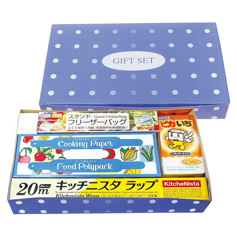 キッチニスタラップ(30cm×20m)・スタンドフリーザーバッグ(5枚)・クッキングペアーセット(キッチンペーパー・ポリ袋各10枚)・ピカいち(メラミンスポンジ)×各1