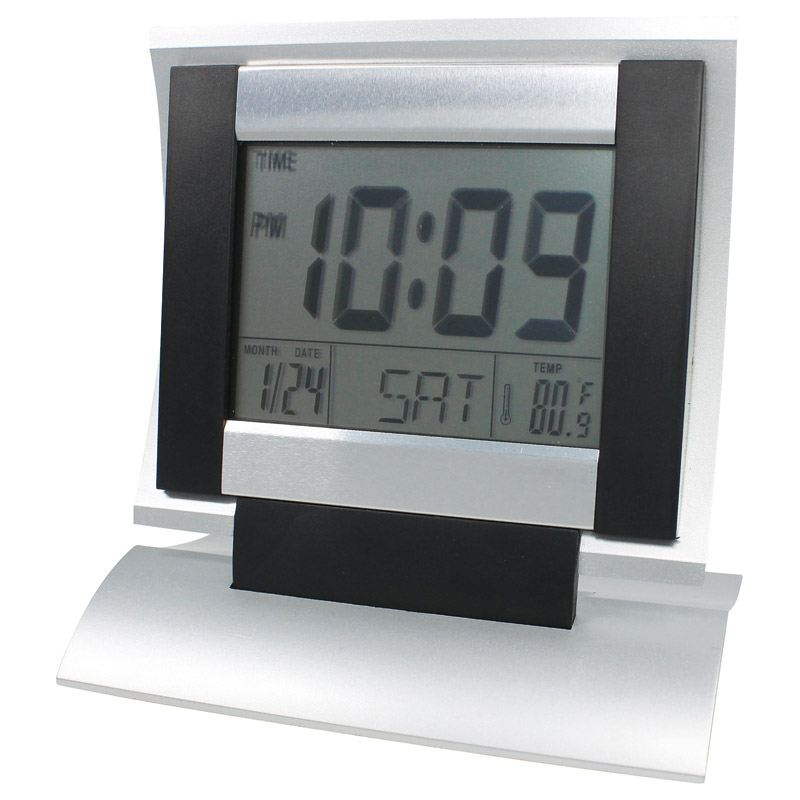 折り畳みタイプで大きな液晶ディスプレイと角度調整ができるデジタルクロックです。カレンダー、時計、アラーム、温度計。