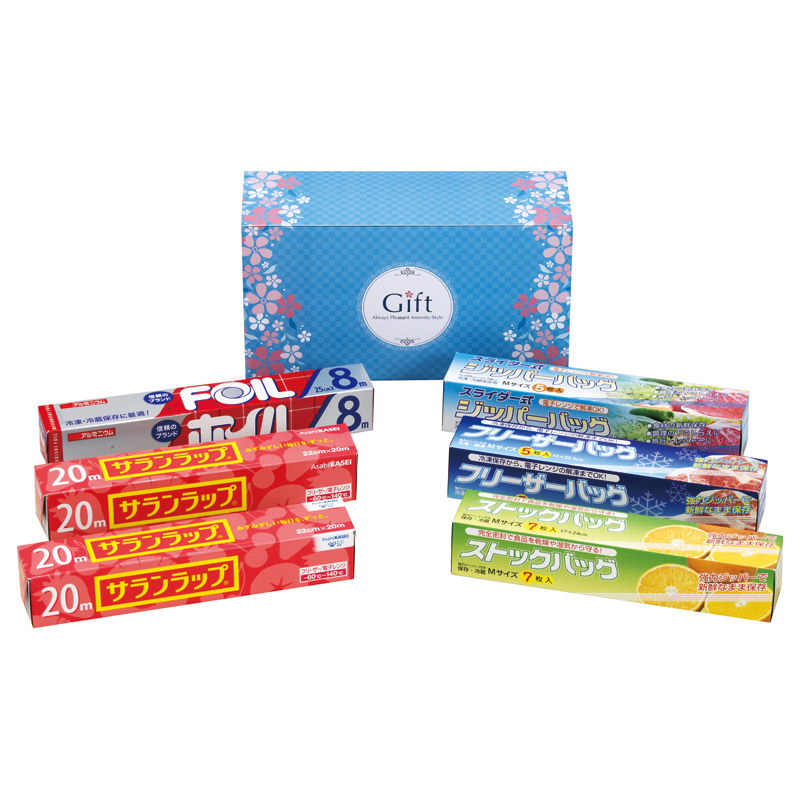 サランラップ(22cm×20m)×2、ストックバッグ(M7枚)・フリーザーバッグ(M5枚)・ジッパーバッグ(M5枚)・アルミホイル(25cm×8m)×各1