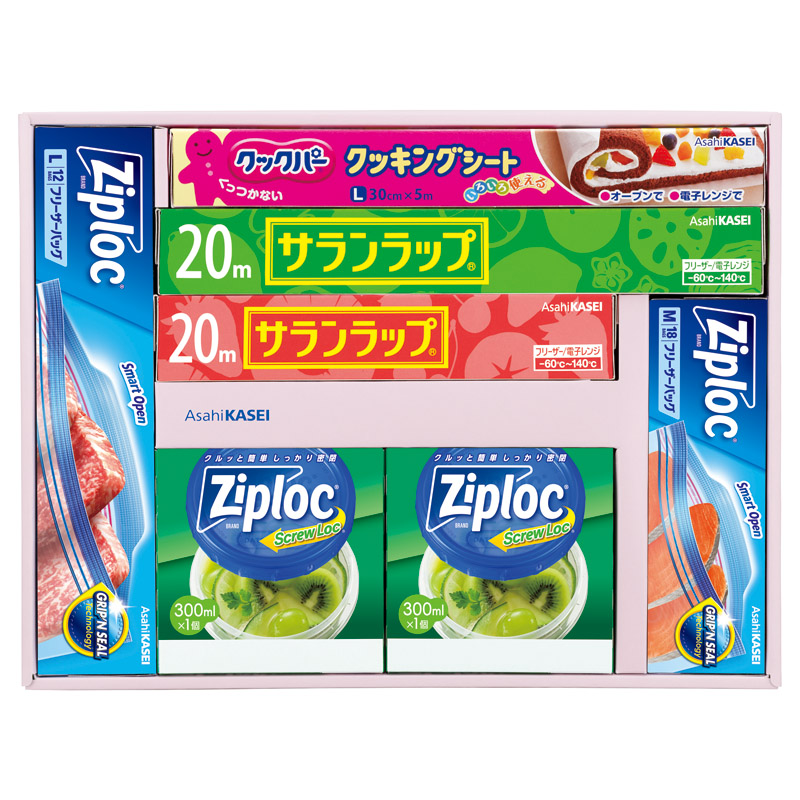 サランラップ(約30cm×20m)・サランラップ(約22cm×20m)・ジップロックフリーザーバッグ(M18枚入)・ジップロックフリーザーバッグ(L12枚入)・クックパークッキングシート(約30cm×5m)×各1、ジップロックスクリューロック(300ml)×2
