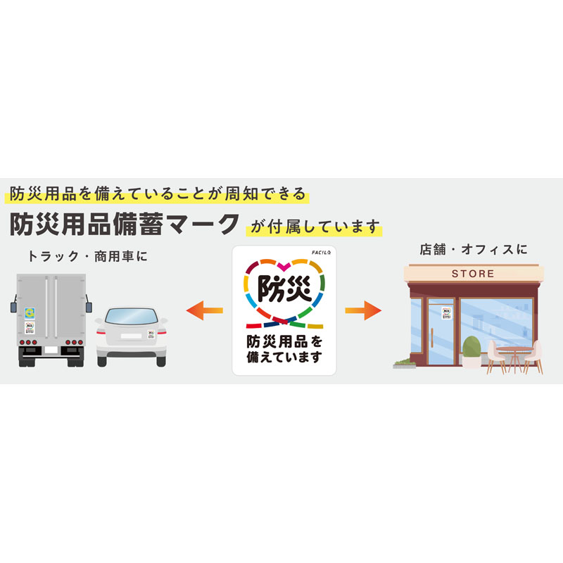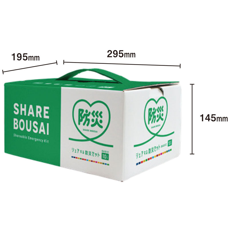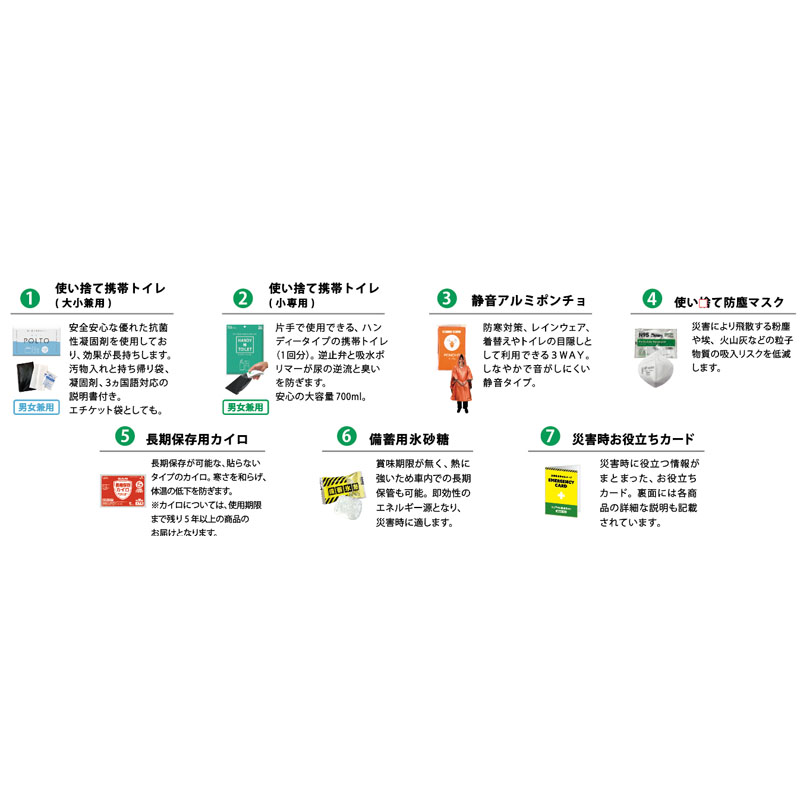 使い捨て携帯トイレ(大小兼用)×10、使い捨て携帯トイレ(小専用)×10、静音アルミポンチョ×10、使い捨て防塵マスク×10、長期保存用カイロ×10、備蓄用氷砂糖×10、災害時お役立ちカード×10、持ち運び&配布用コットンバッグ(マチ:110mm)×1(350×360mm)、防災用品備蓄マーク S×1(150×185mm) (材:ステッカー:塩ビ(耐水性・対候性))