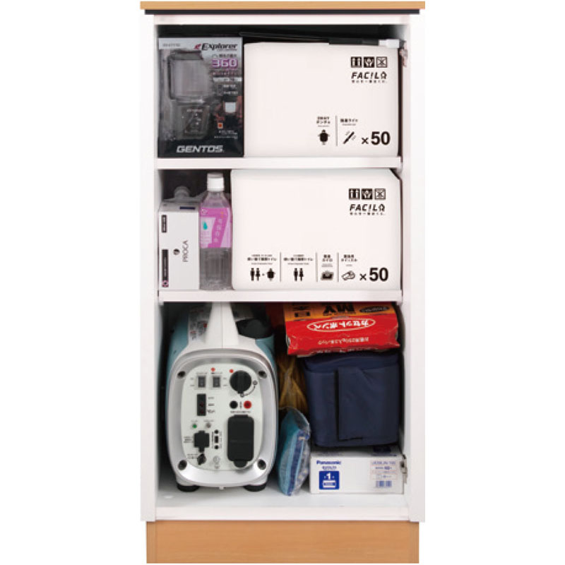 本体スタンド×1(505×500×1015mm)、カセットボンベ式発電機(G-cubic crema smart+)×1、災害用充電器マルチチャージャ×1、防雨型延長コード(10m)×1、備蓄用カセットボンベ×6、ミニカセットコンロ×1、使い捨て携帯トイレ(大小兼用)×50、使い捨て携帯トイレ(小専用)×50、長期保存用カイロ×50、緊急用ホイッスル×50、使い捨て簡易ライト×50、静音アルミポンチョ×50、防塵マスク(DS2)×50、除菌・消臭剤PROCA×1、長尺トイレットペーパー(200m)×2、災害用伝言ホワイトボード×1、防塵・防滴LEDランタン×1、備蓄品配布用PP袋×50
