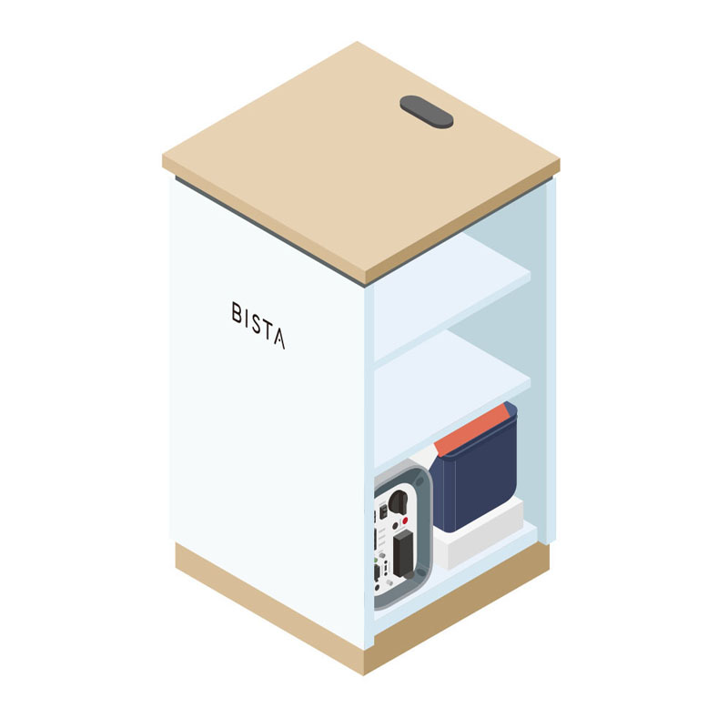 BISTAは、厳選された防災用品がオールインワンで揃ったスマートなデザインの災害用備蓄スタンドです。防災用品を倉庫やロッカーに置くのではなくロビーやエントランス、応接室など、あえて日常的に人が行き交う空間に置くことで普段から防災を意識することができます。