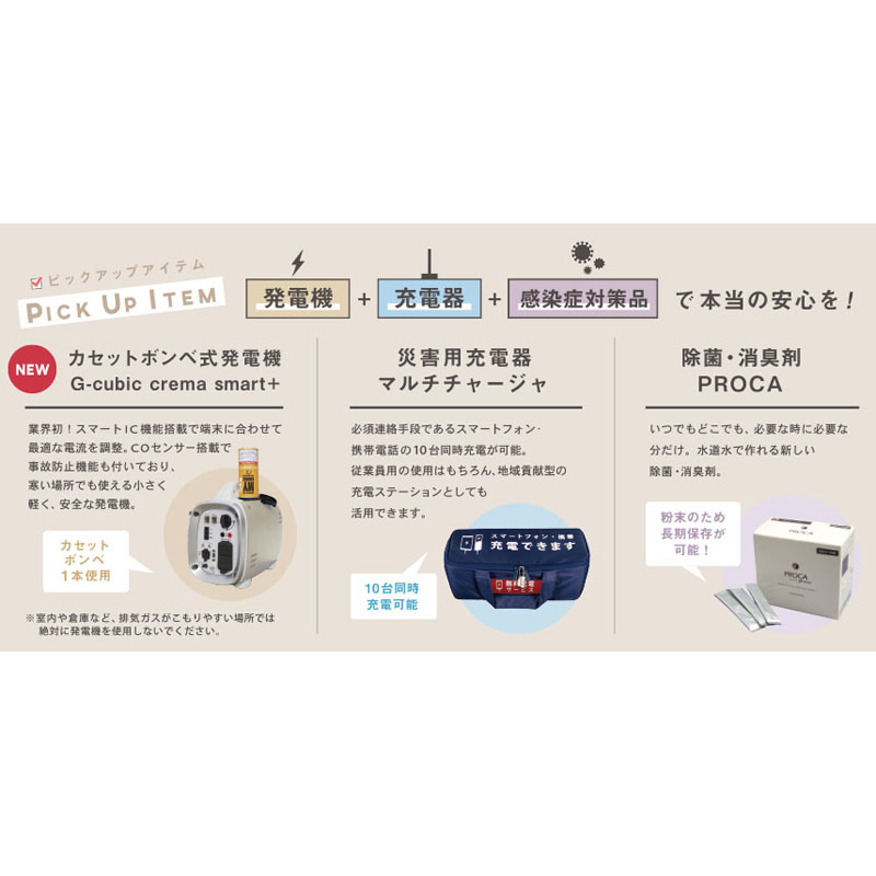 本体スタンド×1(505×500×1015mm)、カセットボンベ式発電機(G-cubic crema smart+)×1、災害用充電器マルチチャージャ×1、防雨型延長コード(10m)×1、備蓄用カセットボンベ×6、ミニカセットコンロ×1