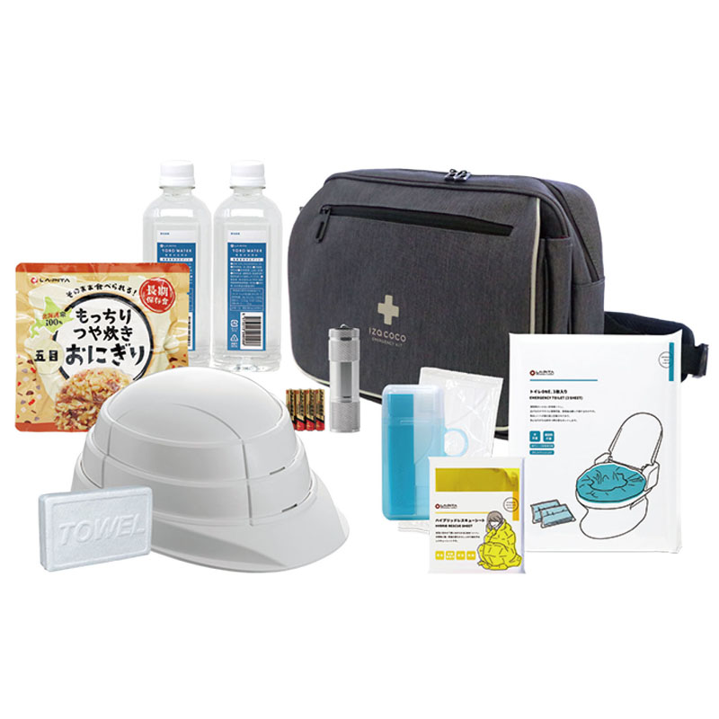 椅子掛け用バッグ(620g)×1(340×240×110mm)、養老の天然水(500ml)×2、オサメット(ホワイト)×1、レスキューシート×1、もっちりつや炊きおにぎり五目×1、トイレONE3枚入×1、個包装マスク×1、カラビナ付アルミCOBライト×1、単四形(4本パック)×1、圧縮タオル×1、コップ付き歯ブラシセット×1