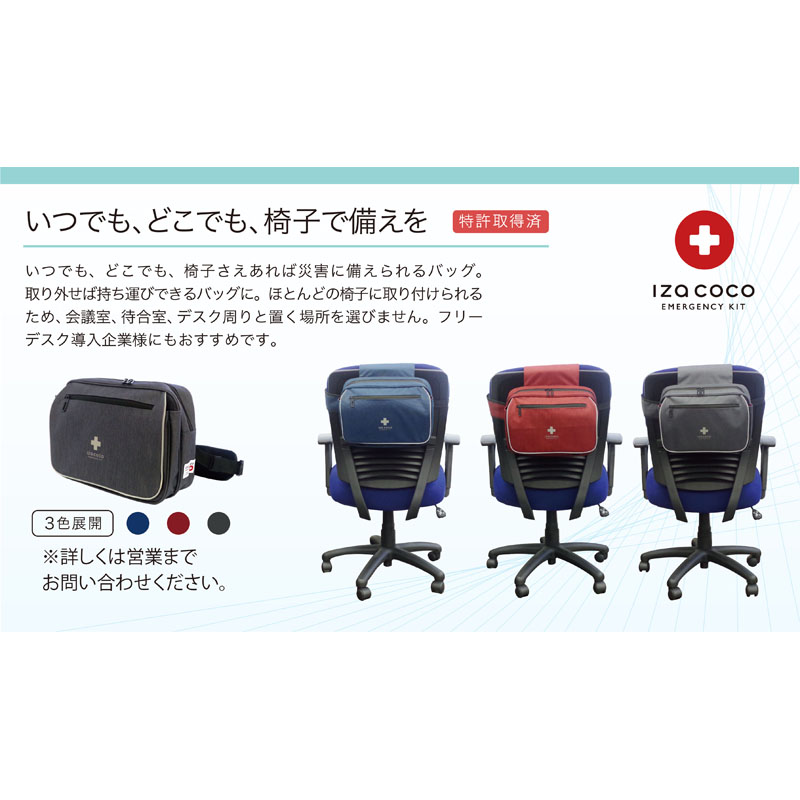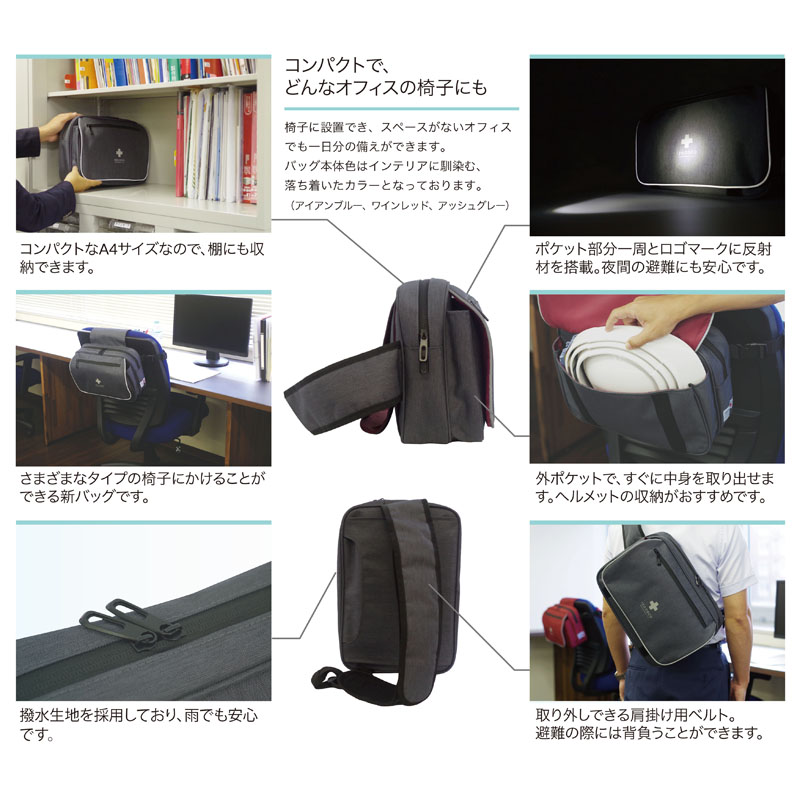 いつでも、どこでも、椅子さえあれば災害に備えられるバッグ。取り外せば持ち運びもできるバッグに。ほとんどの椅子に取り付けられるため、会議室・待合室・デスク周りなど置く場所を選びません。フリーデスク導入企業様にもおすすめです。