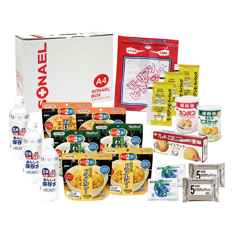 ウェットティッシュ×2、5年保存水(500ml)×3、ライスクッキー8枚入×1、マジックライス(わかめ)×2、マジックライス(五目ごはん)×2、マジックライス(ドライカレー)×2、加熱袋×1、発熱剤×3、水に流せるペーパー×2、カンパン×1、ミルクビスケット×1