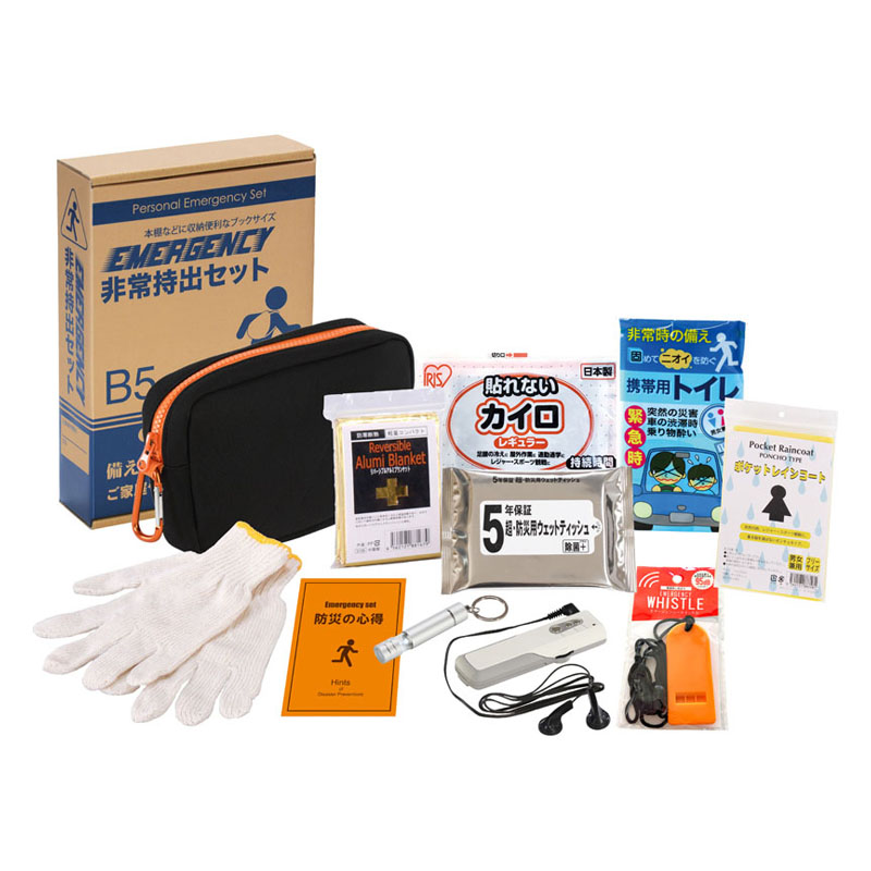 収納ポーチ×1(190×120×50mm) (材:ポリエステル)、アルミブランケット×1、ホイッスル×1、レインコート×1、携帯用トイレ1P×1、LEDライト×1、FMラジオ×1、防災ウェットティッシュ×1、カイロ1P×1、軍手×1、防災の心得×1