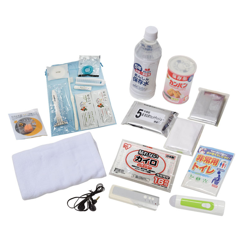 ハンディライト×1、防寒シート×1、保存水(500ml)×1、カンパン(100g)×1、カイロ×1、非常用トイレ×1、防災用ウェットティッシュ(20枚)×1、宿泊セット用ポーチ×1、カミソリ×1、二つ折りコンパクトブラシ×1、シャンプー&コンディショナー×1、石鹸×1、タオル×1、ヘアーバンド×1、アイマスク×1、耳栓×1、ポケットティッシュ(8W)×1、ハブラシセット×1、コンパクトFMラジオ×1