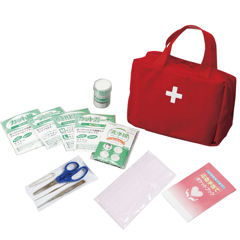 救急バッグ×1(230×100×155mm) (材:ポリエステル)、カット綿(3枚入)×1、包帯×1、カットガーゼ(3枚入)×1、救急絆創膏(2サイズ×3枚入)×1、サージカルテープ×1、清浄綿(2枚入×3包)×1、ハサミ×1、ピンセット×1、耳かき×1、毛抜き×1、マスク×1、応急手当てポケットブック×1