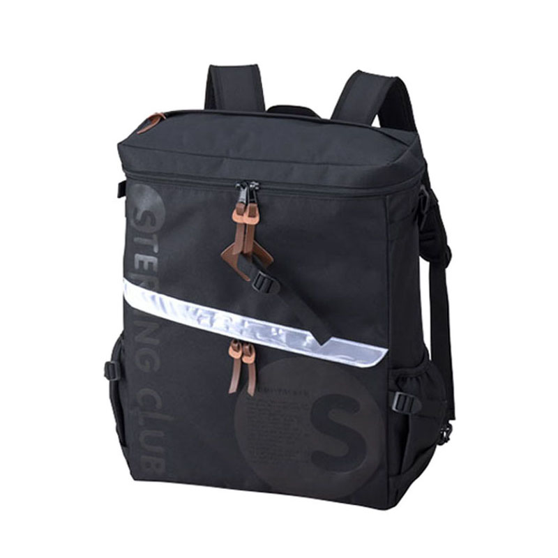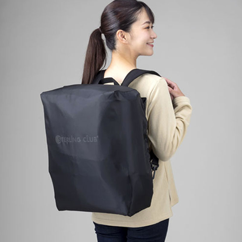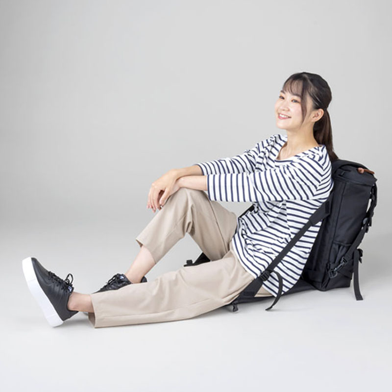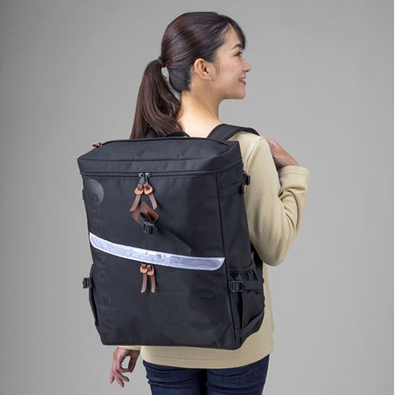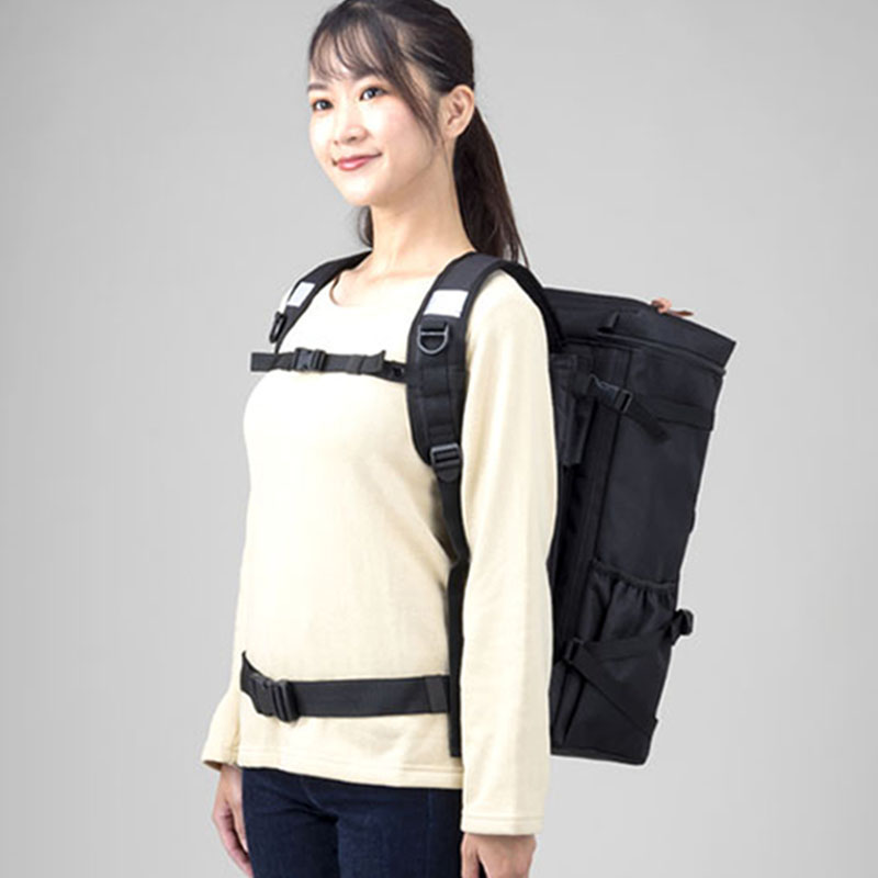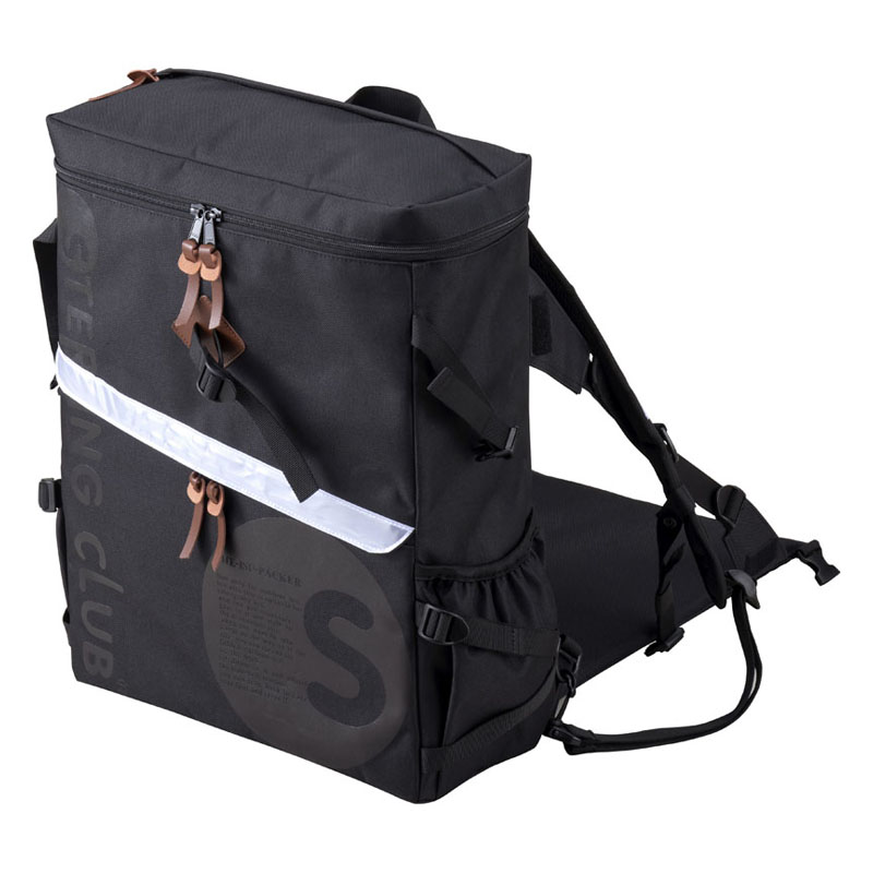 開閉式座椅子クッション、レインカバー、光反射テープ付フロントポケット、ショルダーベルト、サイドポケット、ギアホルダー、カード入れ、ウエストベルト、チェストストラップ、コンプレッションベルト