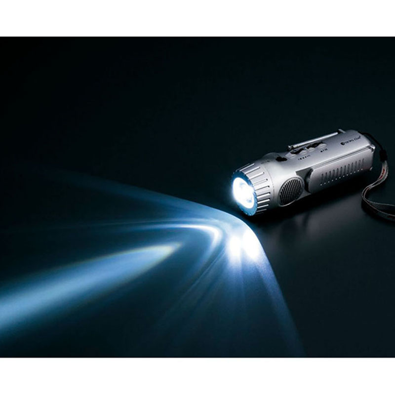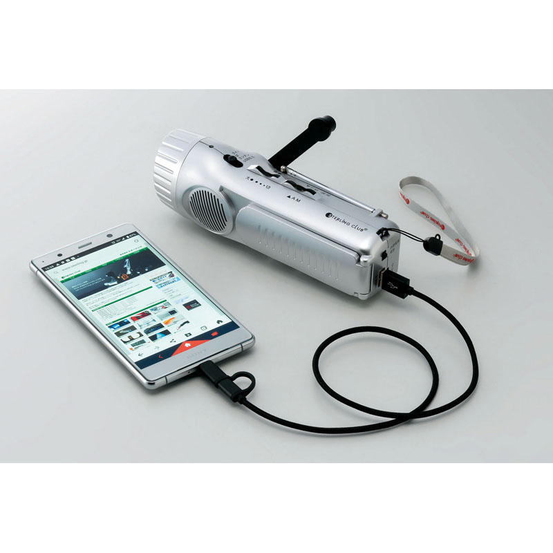 LEDライト、LEDランタン、AM/FMラジオ、サイレン、プラグイン携帯充電機能、ダイナモハンドル、USB充電機能、AC/USBアダプター対応(別売)、iPhoneにはお客様がお持ちの純正ケーブルをご使用下さい。