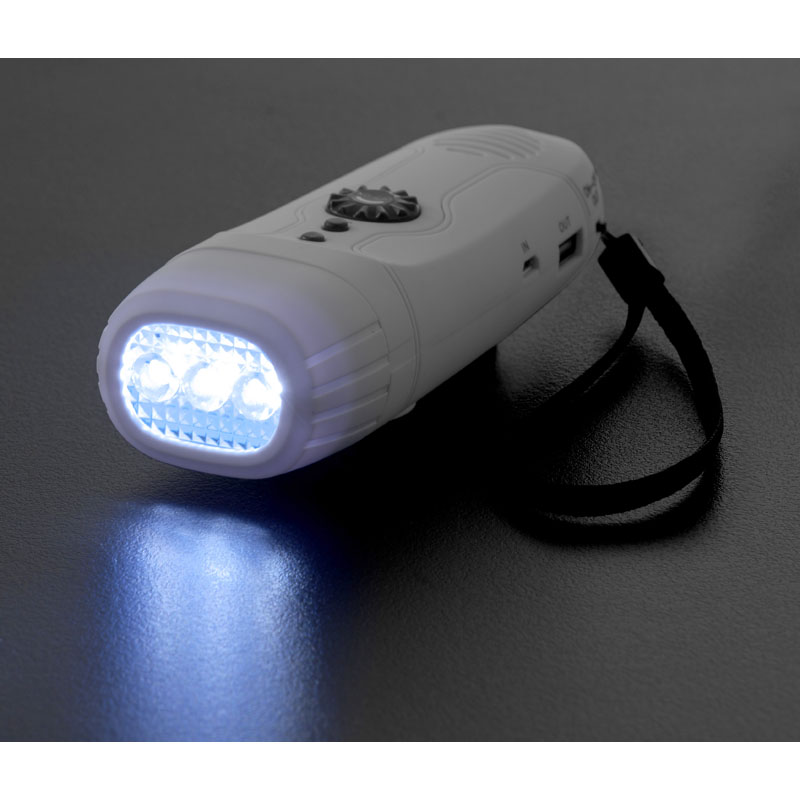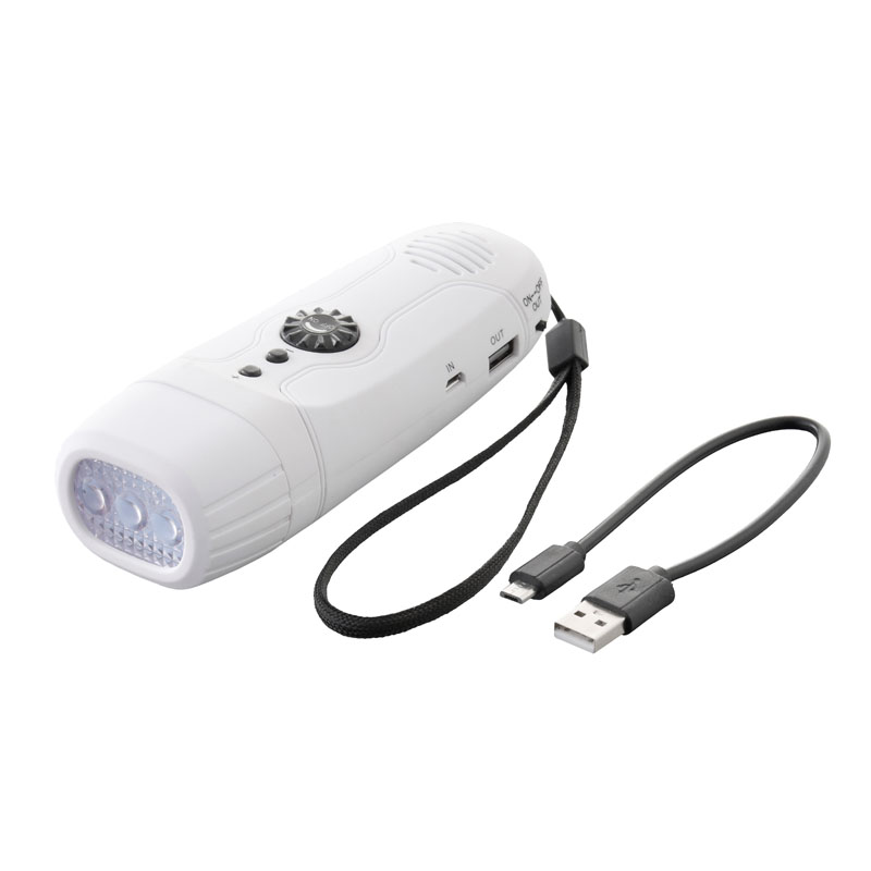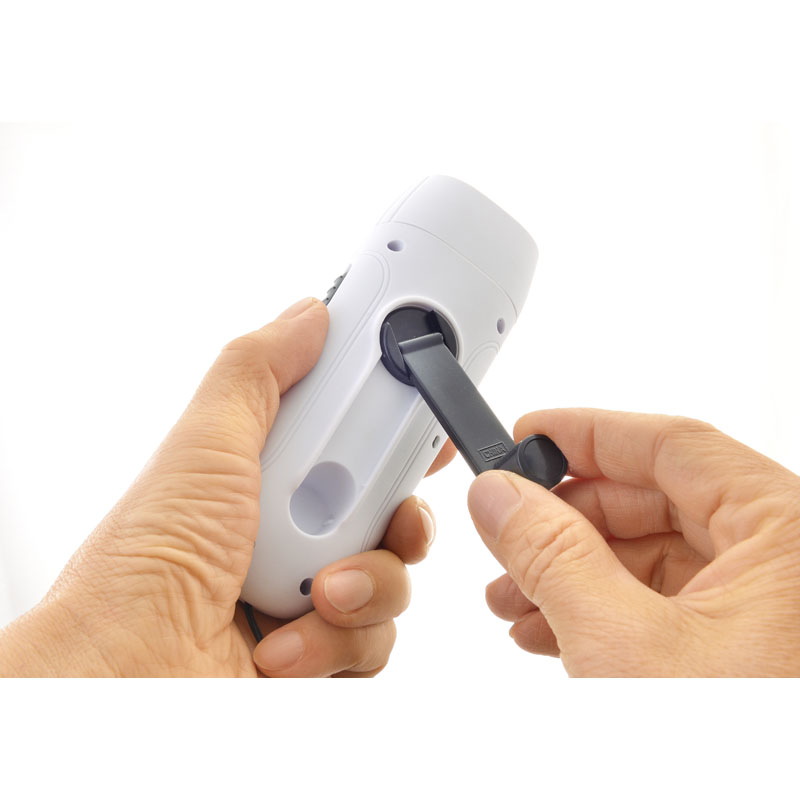 4機能付(1)LEDライト、(2)ワイドFM対応ラジオ、(3)スマホ充電、(4)サイレン機能付。※1充電目安(1分間の回転)ライト点灯時間:約10分間/ラジオ稼働時間:約10分間。※2電源:ニッケル水素電池3.7V、950mAh※3USB接続で、本体の満充電に約4時間かかります。満充電でスマホ(iPhone6)へは約30%充電可能。※スマートフォン、携帯電話のケーブルは付属していません。※一部未対応機種あり。