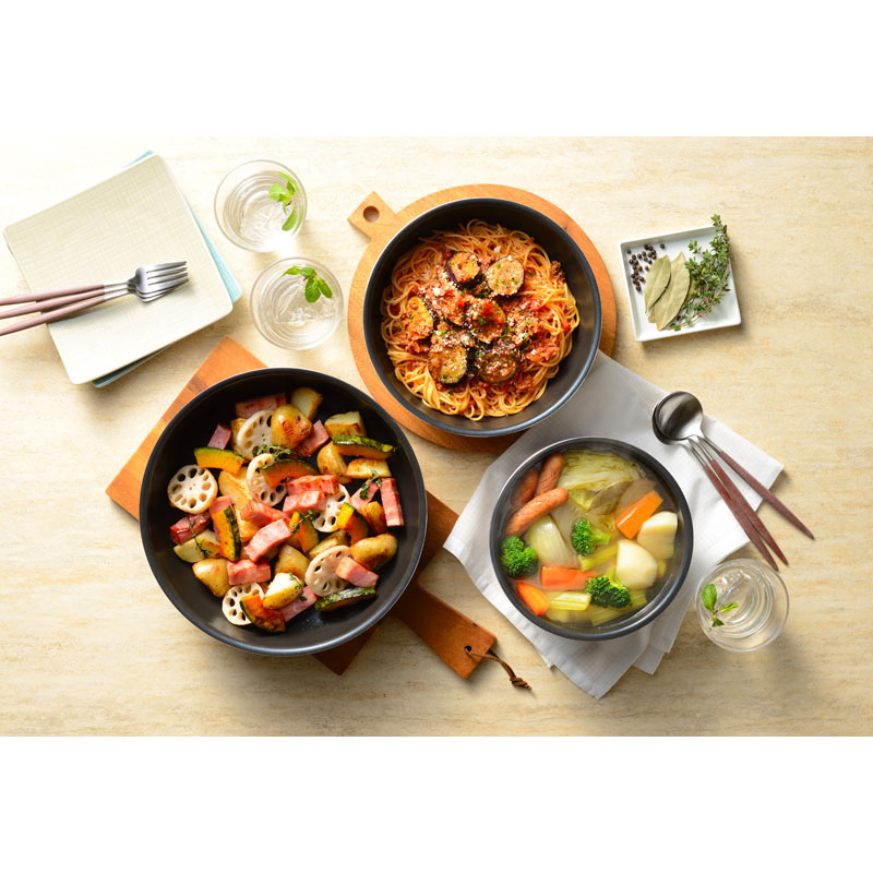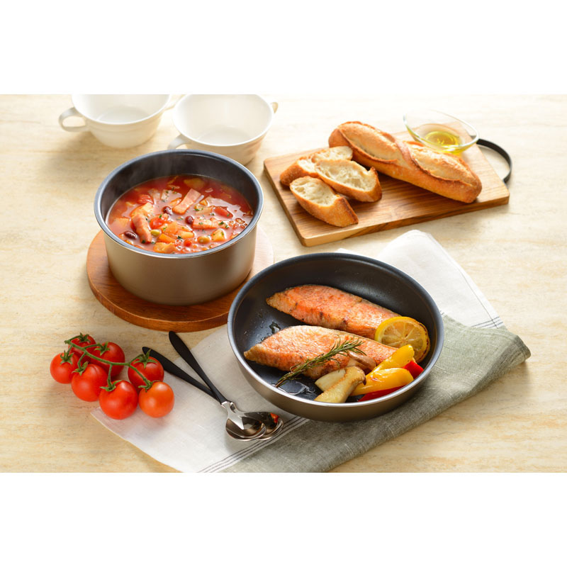 鍋16cm(370g)(1.5L)×1(φ175×82mm)、フライパン20cm(350g)×1(φ215×48mm) (材:本体:アルミニウム合金、底面:ステンレス鋼、内面:フッ素樹脂加工(ダイヤモンドコート)、外面:焼付塗装)、シリコーン巻きガラス蓋16cm×1(170×165×39mm) (材:蓋:強化ガラス・シリコーン樹脂)、着脱ハンドル×1