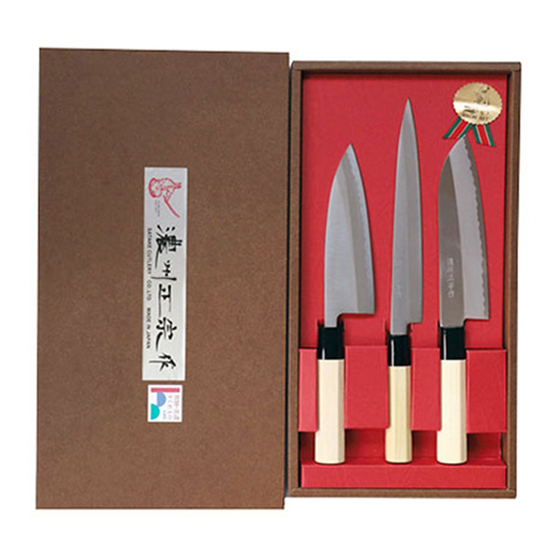 三徳包丁(刃渡170mm)×1、出刃包丁(刃渡155mm)×1、刺身包丁(刃渡205mm)×1 (材:高炭素刃物鋼、柄:天然木)