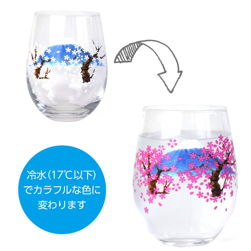 17℃以下の飲み物を注ぐと柄の色が変化します。きれいな桜が咲き華やかなグラスになります。